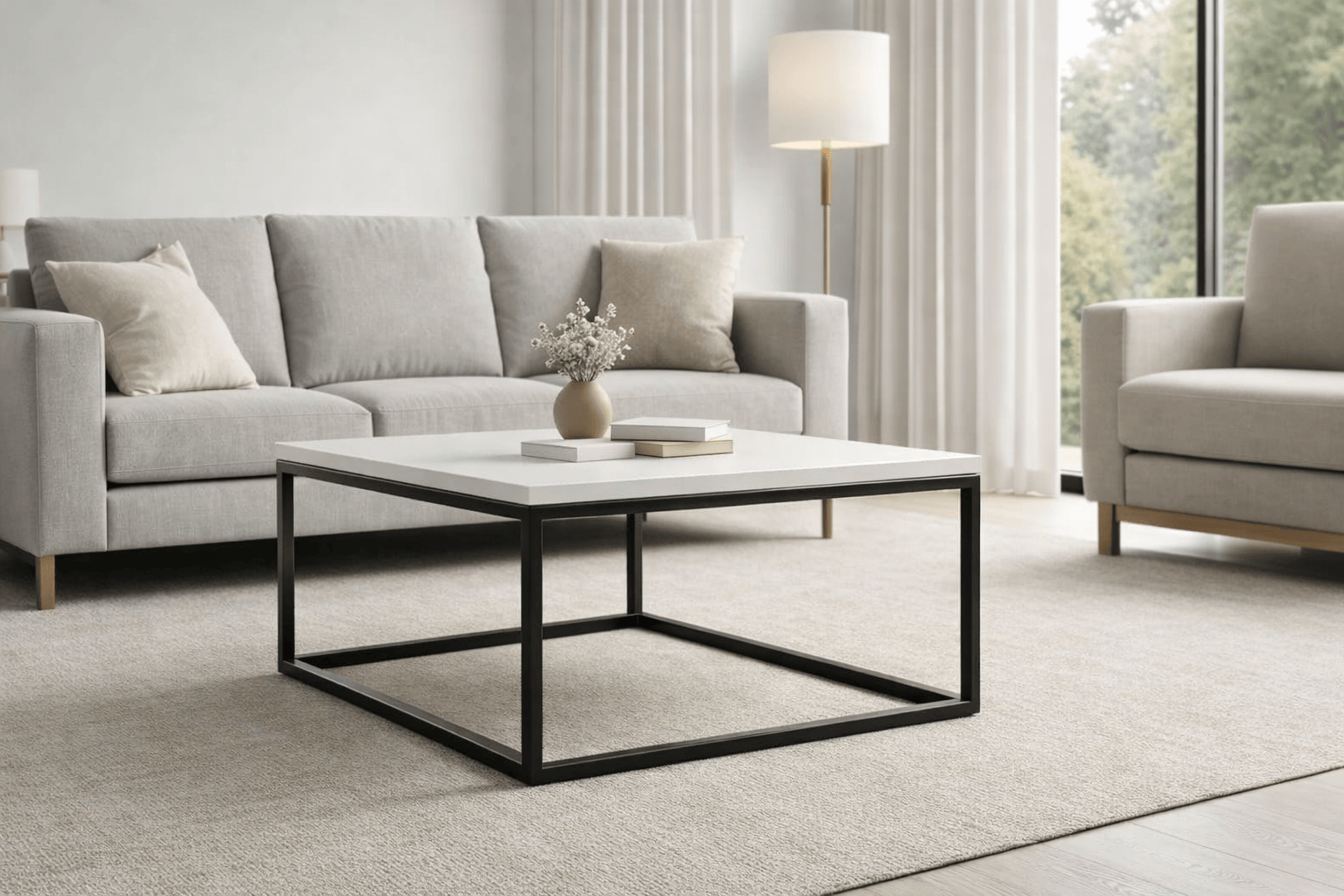 Tavolino con forma quadrata e dimensioni 80 × 80 × 40 cm. Realizzato con piano in colore bianco e struttura in colore nero. Linee pulite e costruzione progettata per garantire stabilità e funzionalità.
